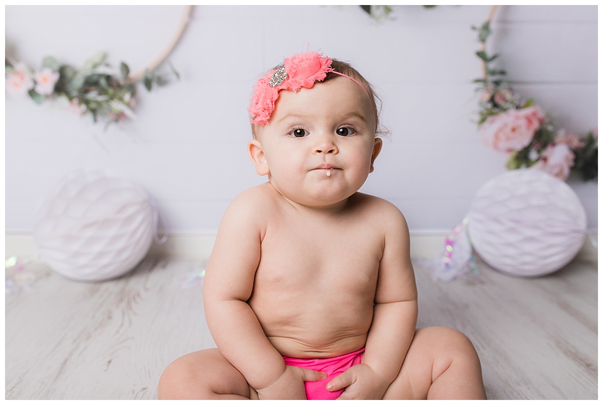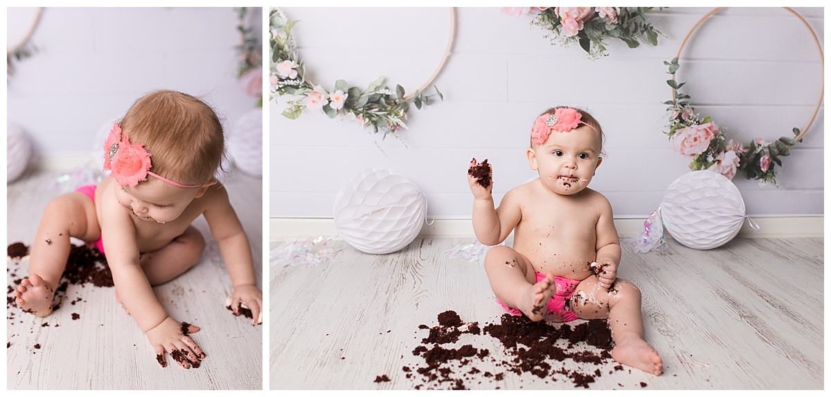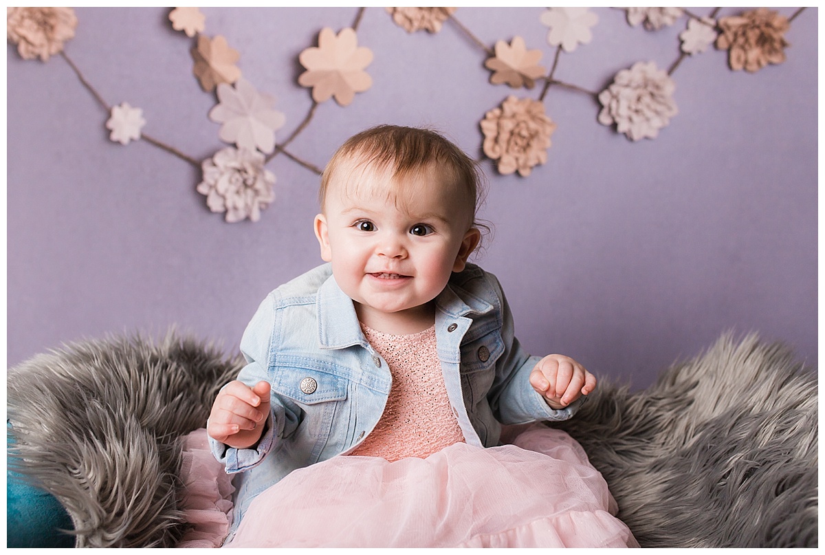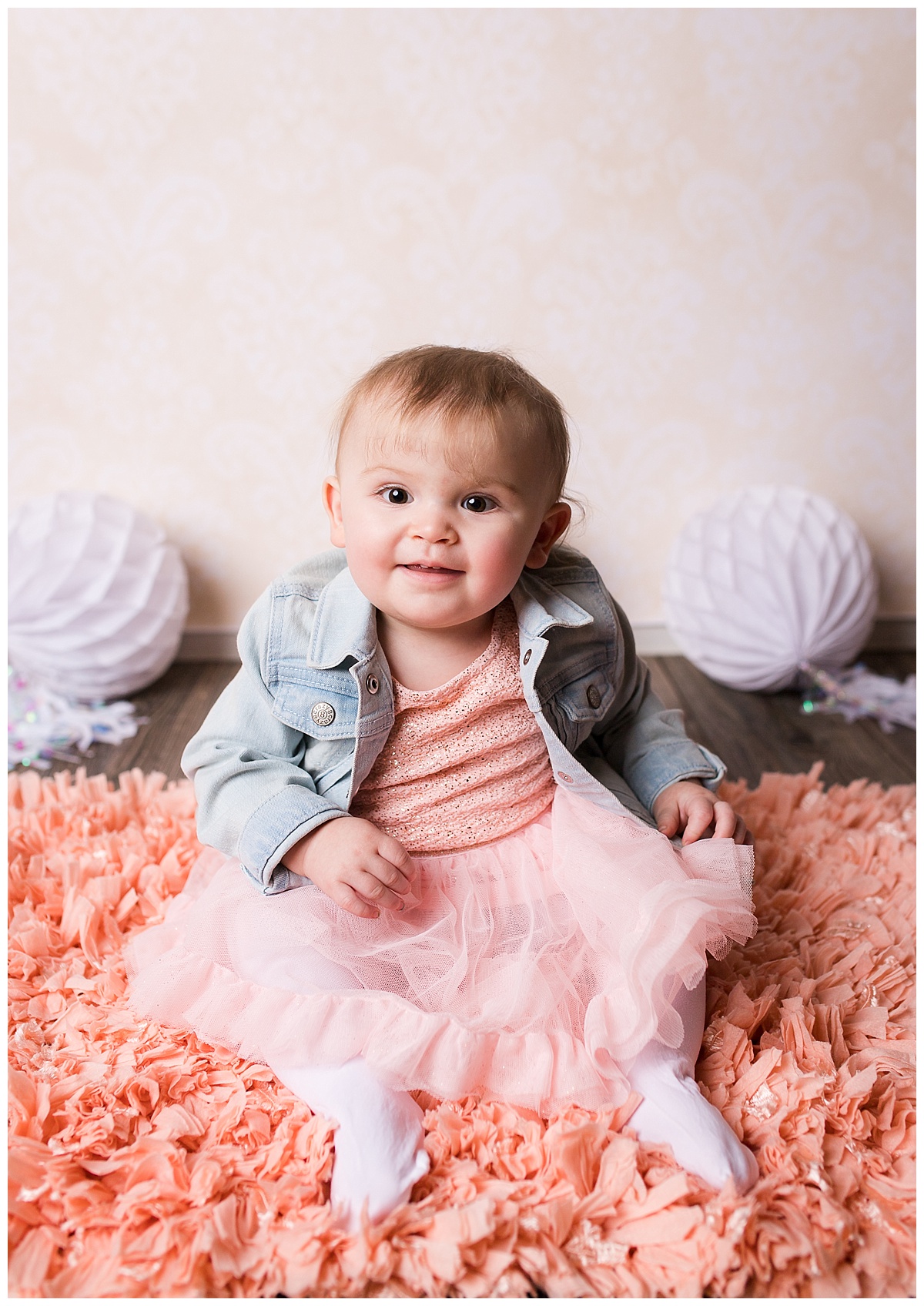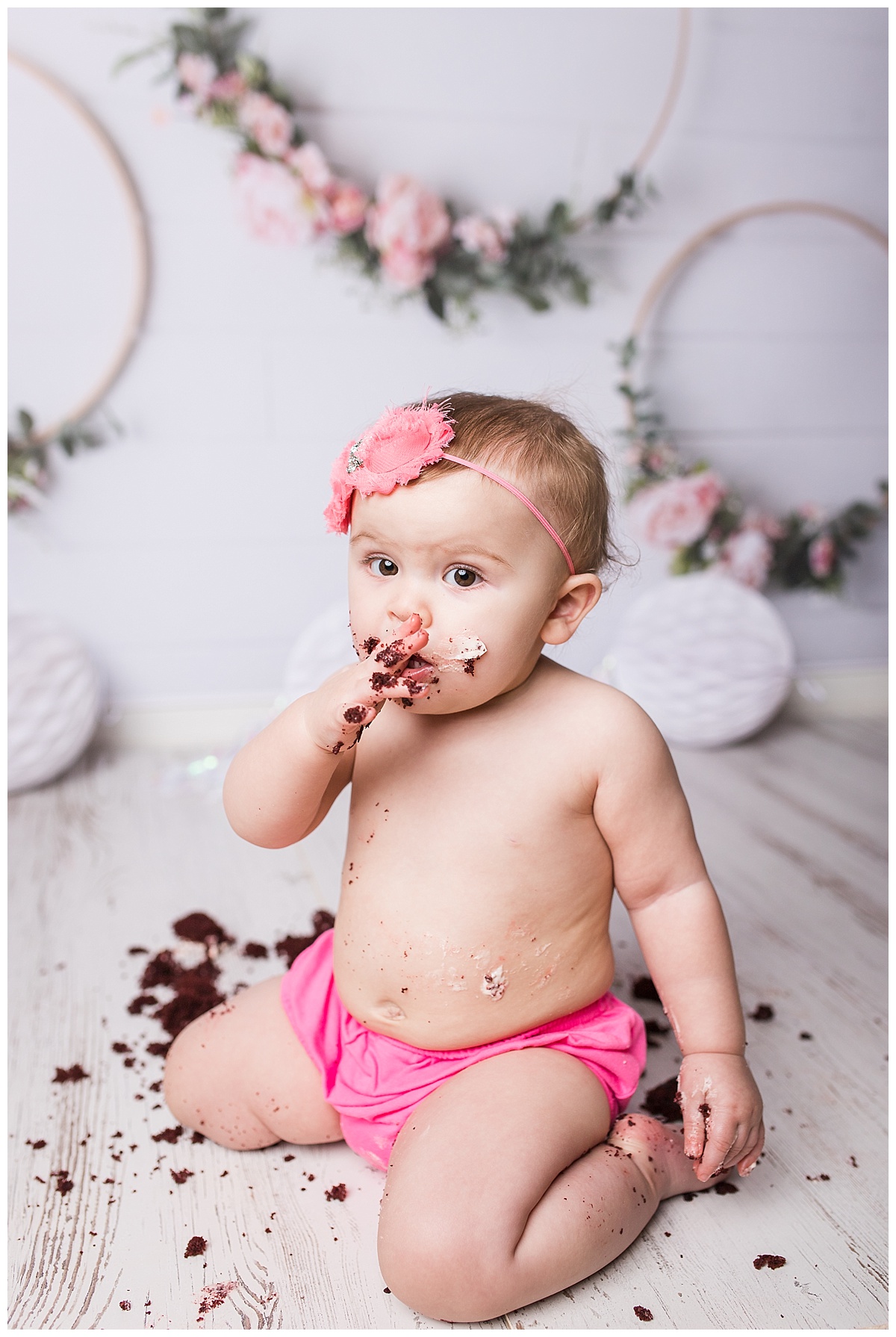 Hi there! Check out the cuteness I have for you tonight. I met Miss Mila last week for her one year cake smash session and she was SO fun to have in the studio. This little girl is super spunky and full of personality which I loved. Also, this girl loves her some cake! She picked up the whole thing and went to town on that cake! It was so funny and so adorable and it made for some awesome photographs.