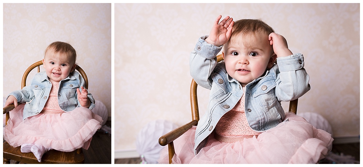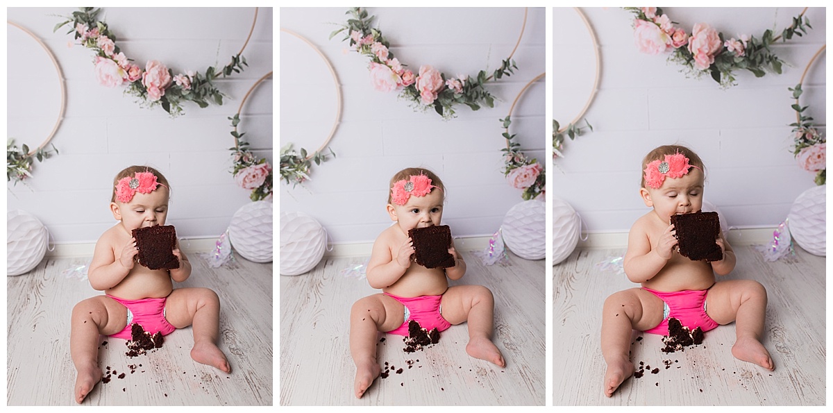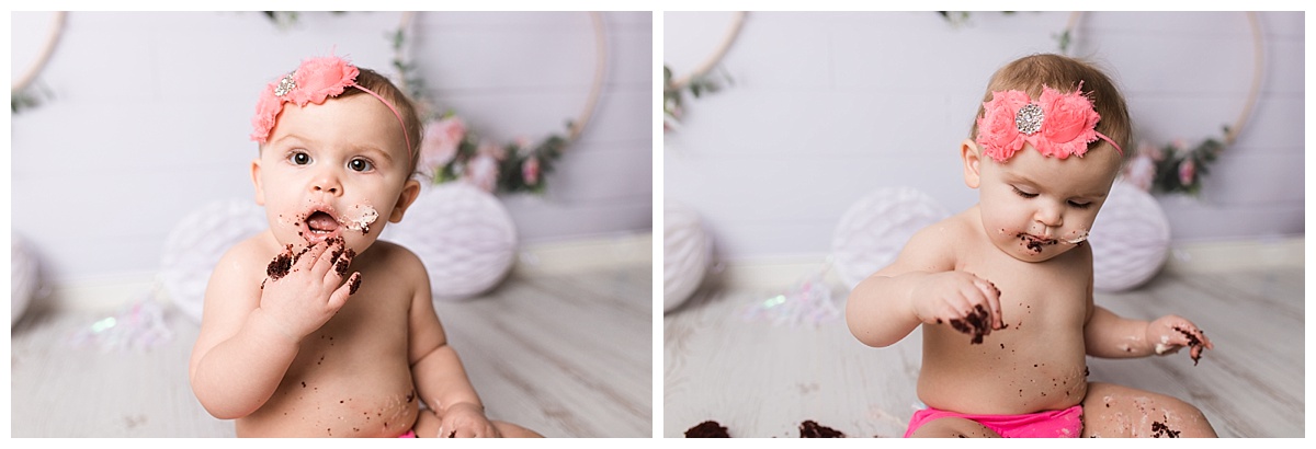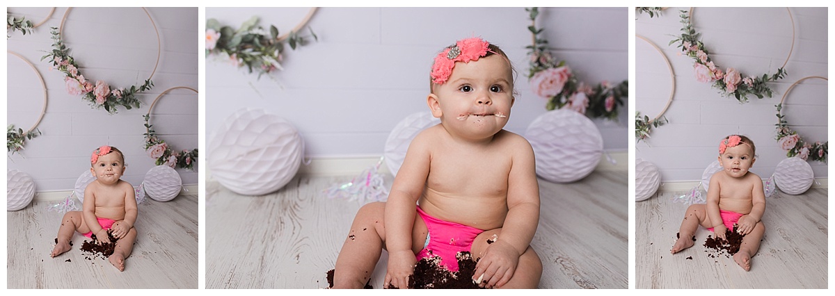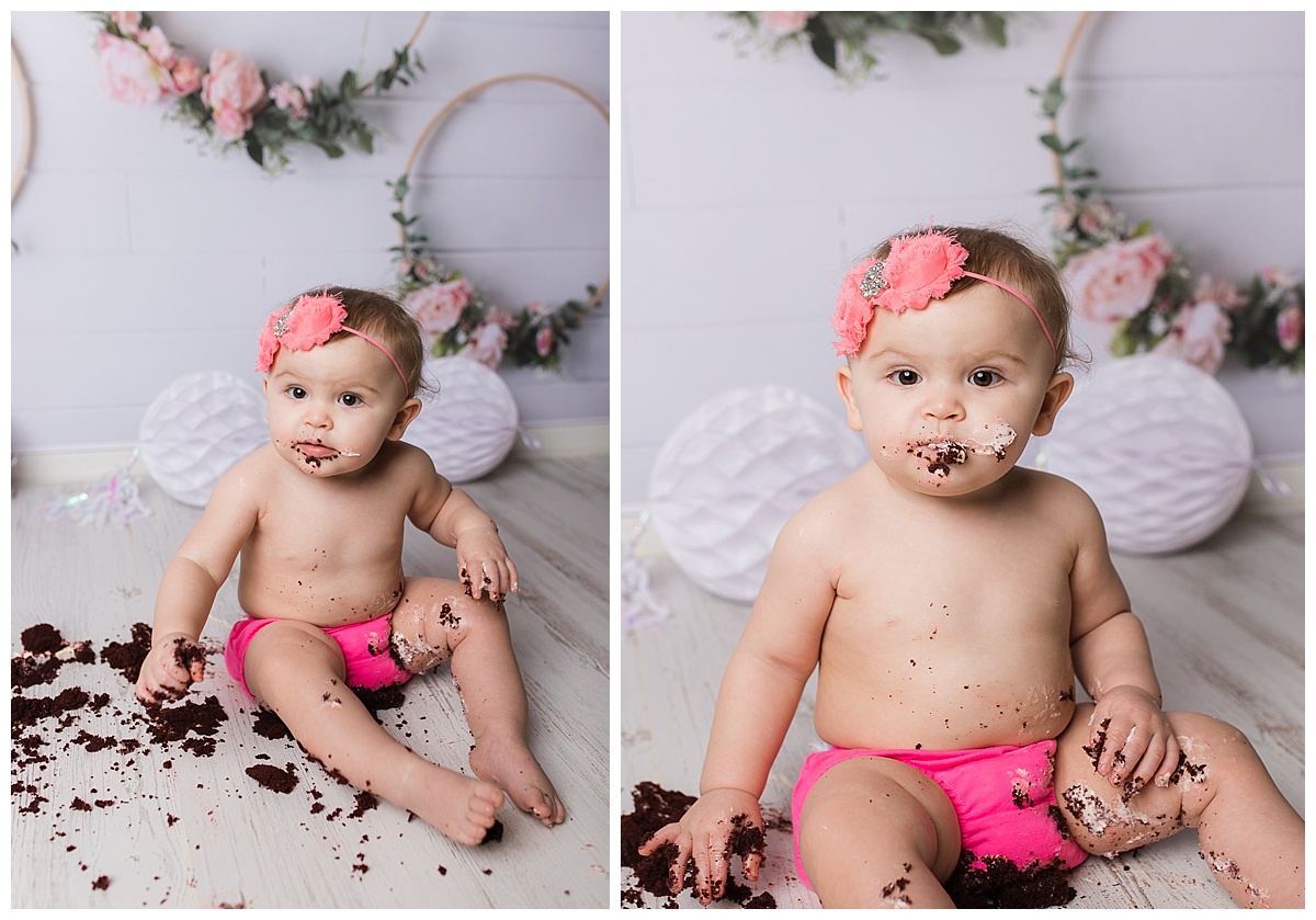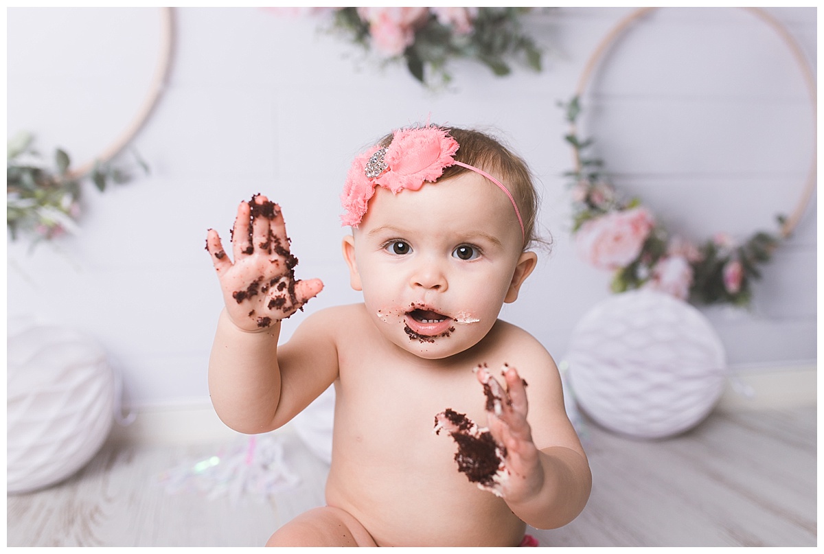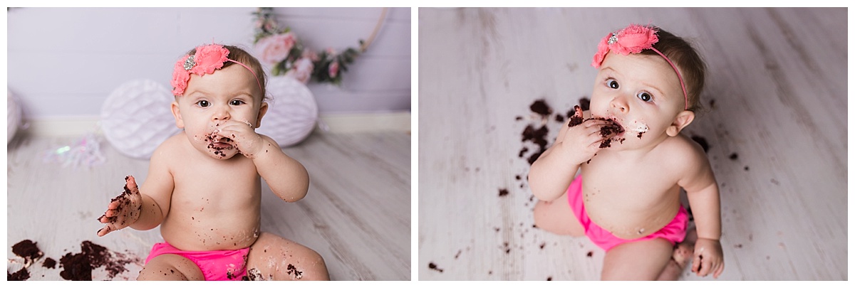 Hi there! Check out the cuteness I have for you tonight. I met Miss Mila last week for her one year cake smash session and she was SO fun to have in the studio. This little girl is super spunky and full of personality which I loved. Also, this girl loves her some cake! She picked up the whole thing and went to town on that cake! It was so funny and so adorable and it made for some awesome photographs.